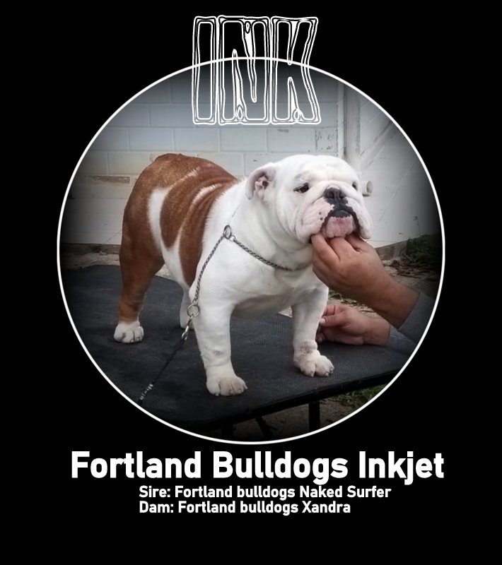 Fortland Bulldogs Inkjet ![]() Multi Ch Fortland Bulldogs Naked Surfer Aka Brown x Fortland Bulldogs Xandra |